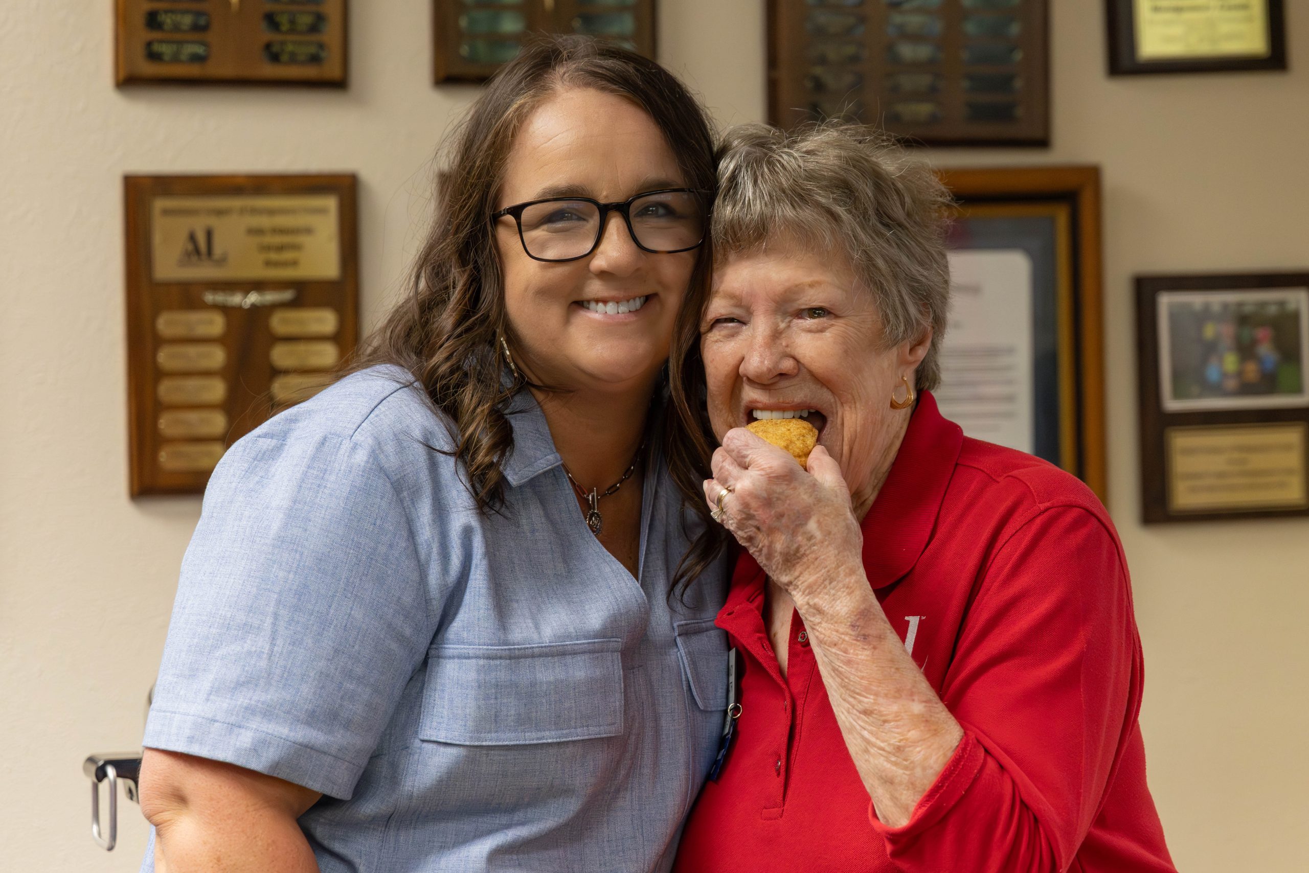 Tally Jo Stout, Conroe ISD CTE Director supplied the cookies for the celebration of reaching the two million goal of scholarships. Sandy Katri, VP Programs is enjoying cookie.