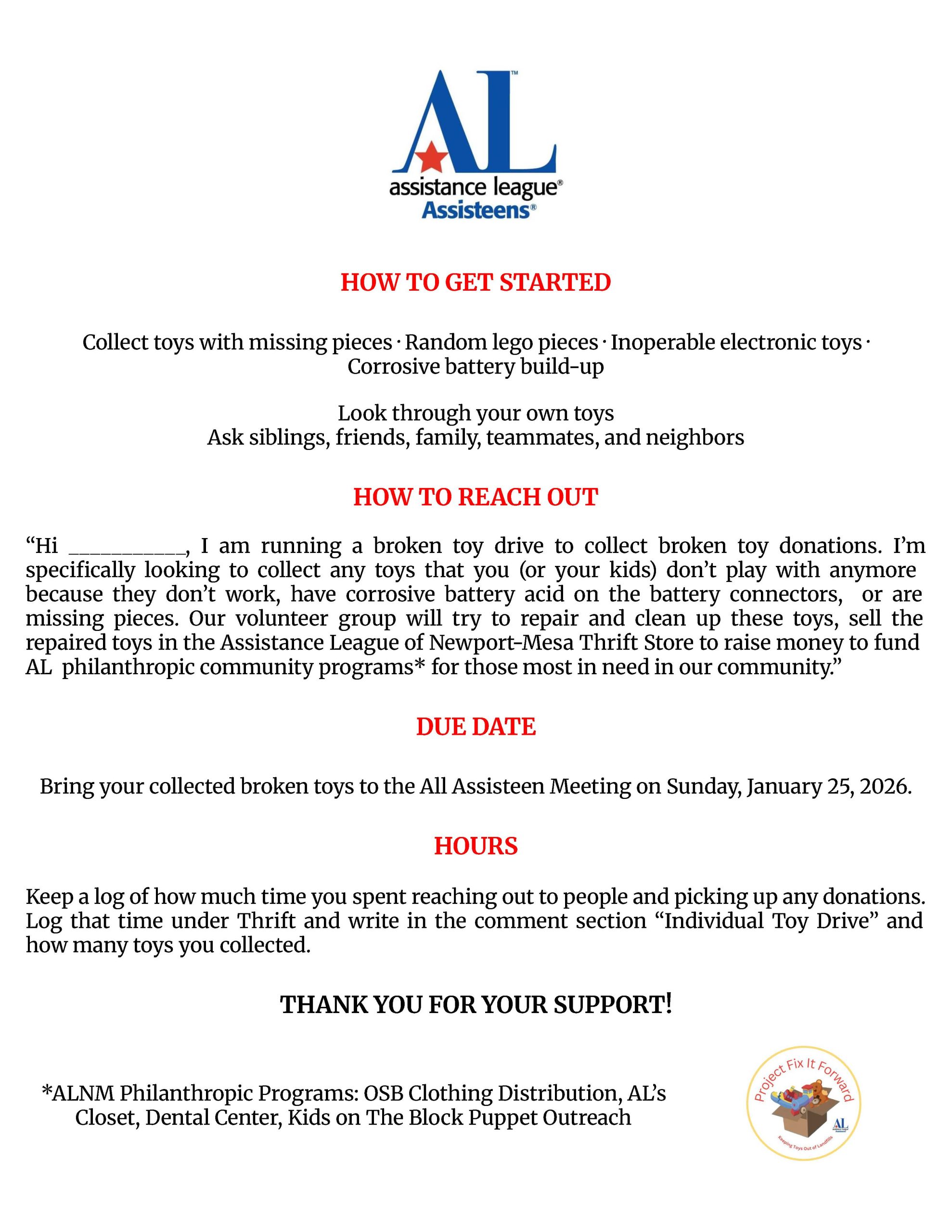 Attached is a flyer with instructions for collecting broken toys. Once we have the toys, you will receive a sign up to come help give these toys a second chance during a work party.