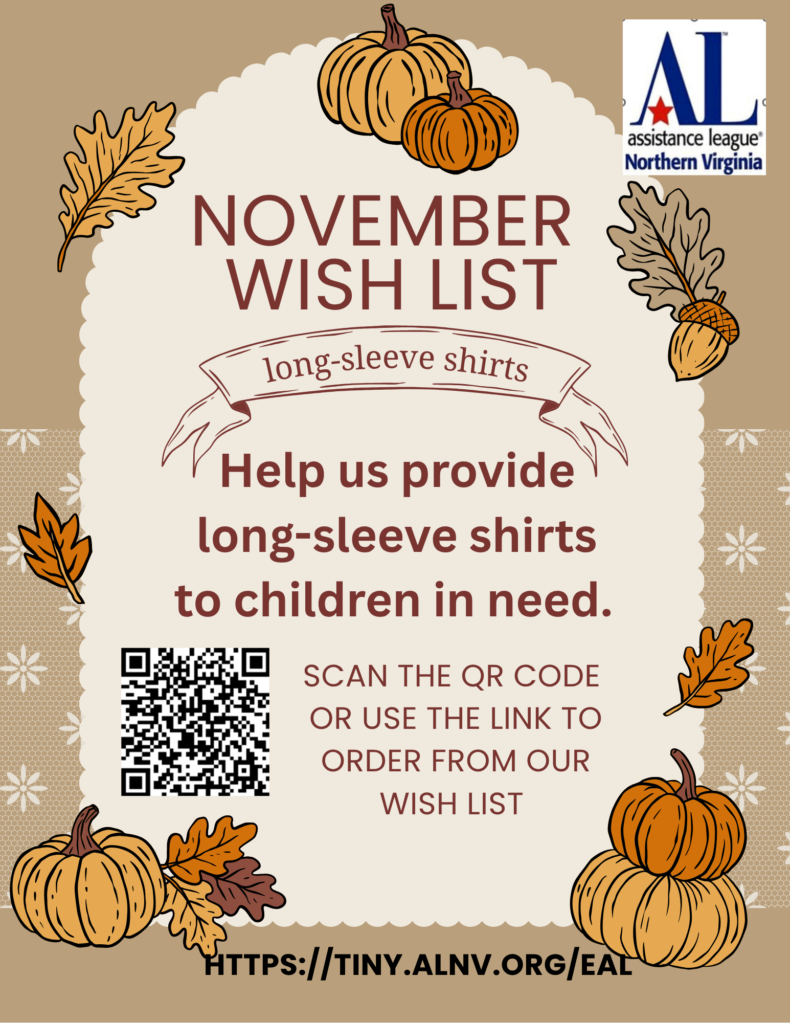 Your contribution from the wide selection of wish list items for boys and girls can allow the students we serve share in the spirit of Thanksgiving as the holiday approaches.  Use this link https://tiny.alnv.org/eal or scan the QR code on the flyer to make a selection.  Please select Assistance League of Northern Virginia as the shipping address to assure prompt delivery.  If you would prefer not to order through Amazon, you can pay by personal check for these items. Please send your check, made out to ALNV, to P.O. Box 209, Herndon, VA  20172, and include “Wish List/month” in the memo line. (E.g., if you order in November, please write Wish List/November).