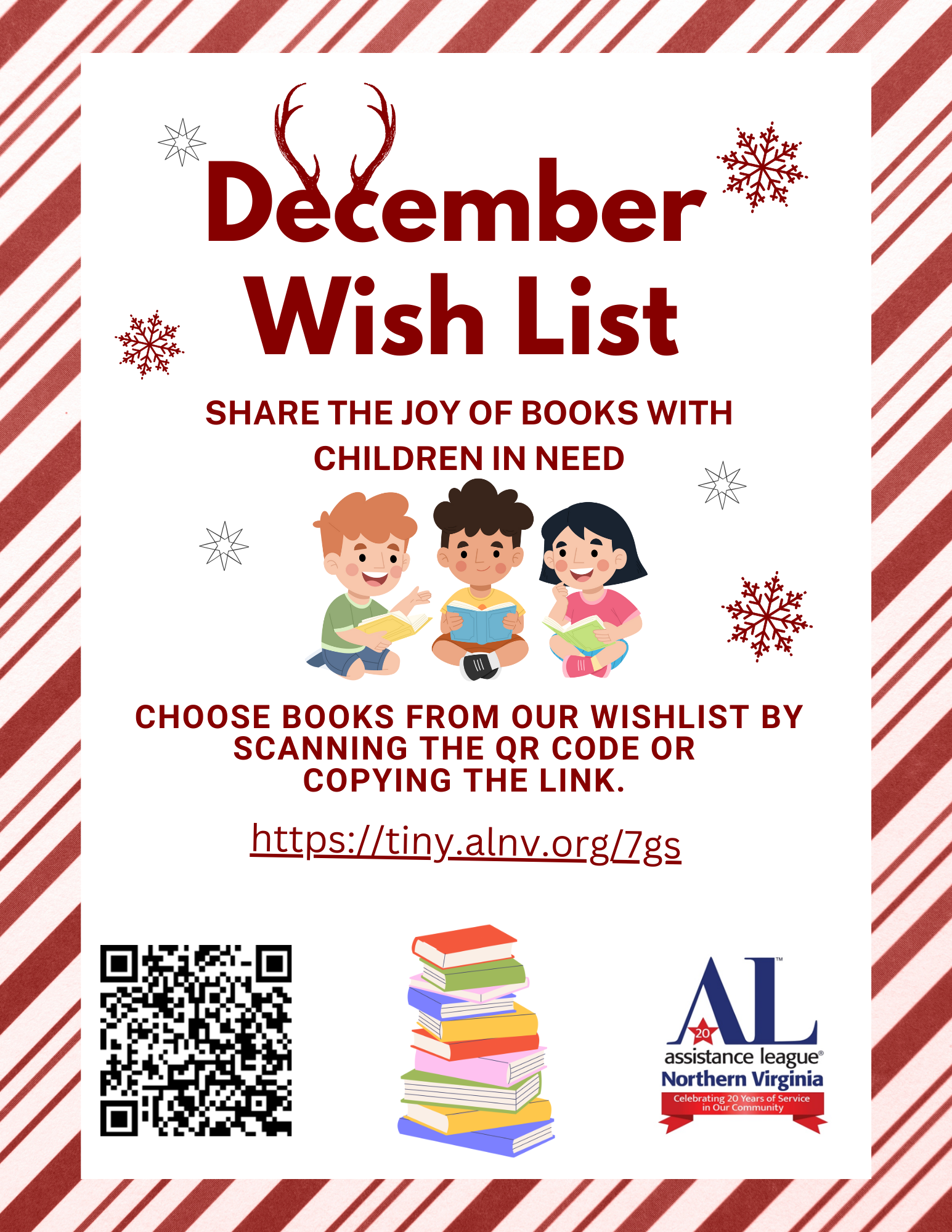 You can share in the delight these students experience in choosing their books by making your own selections from our December wish list that features a wide range of books. Use this link: https://tiny.alnv.org/7gs or scan the QR code on the flyer to make your selections. Choose Assistance League of Northern Virginia as the shipping address to ensure prompt delivery. If you prefer not to order through Amazon, you can pay by personal check for your selected items. Send your check, made out to ALNV, to P.O. Box 209, Herndon, VA 20172, and include “Wish List/month” in the memo line. (E.g., if you order in December, please write Wish List/December.