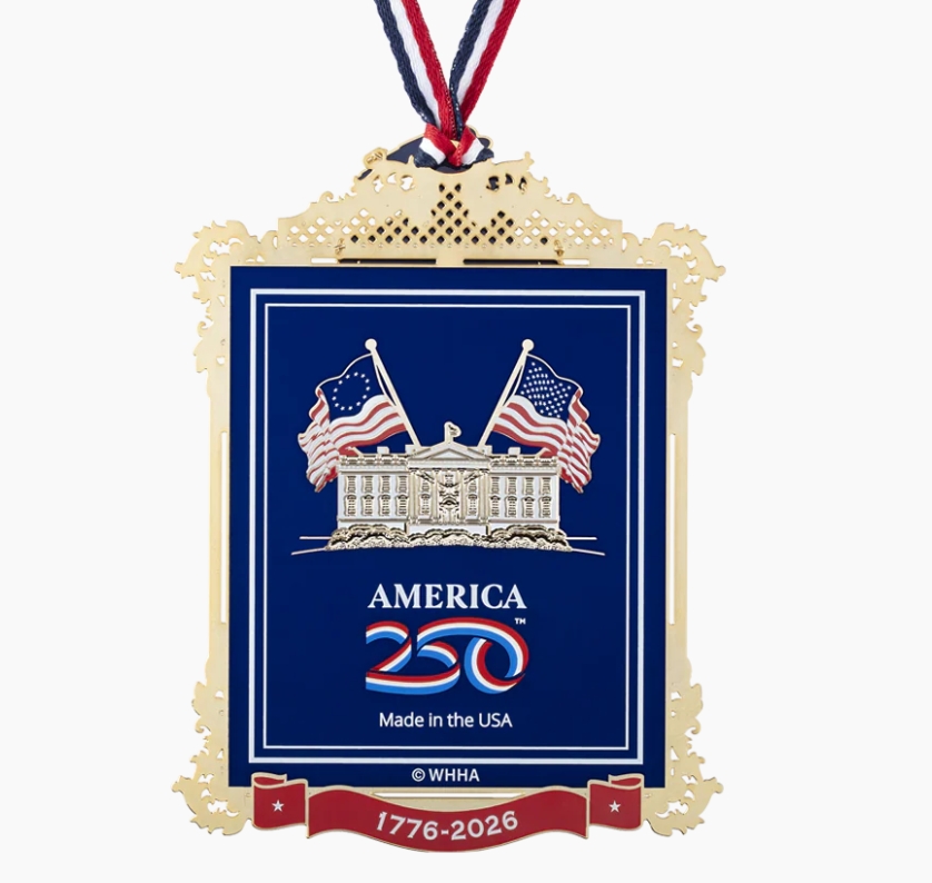 America is celebrating its 250th birthday this year, and we are joining in the celebration by offering the Official White House Ornament that commemorates this historic event. Each year, the White House Historical Association creates a new design to commemorate a special event, person, or place. This year’s ornament honors America’s 250th milestone anniversary. It was designed by the White House Historical Association and licensed by the America250 organization.