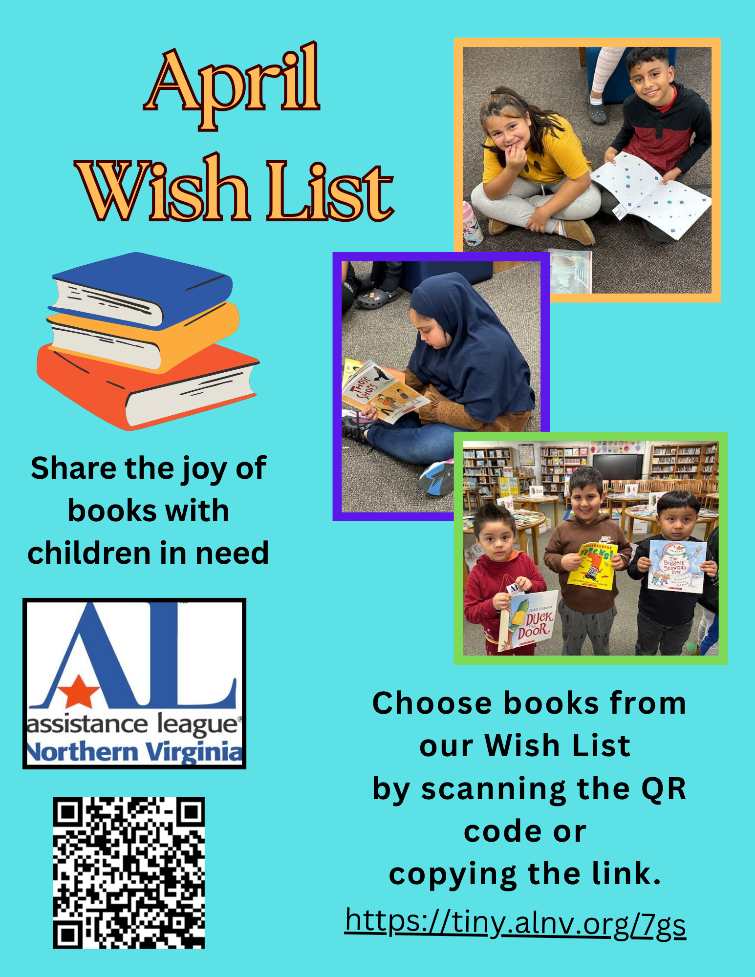 Use this link: https://tiny.alnv.org/7gs or scan the QR code on the flyer to make your selections, and choose Assistance League of Northern Virginia as the shipping address for prompt delivery. If you prefer not to order through Amazon, you can make a donation and send a personal check for the items. Send your check, made out to ALNV, to P.O. Box 209, Herndon, VA 20172 and include “Wish List/April in the memo line.