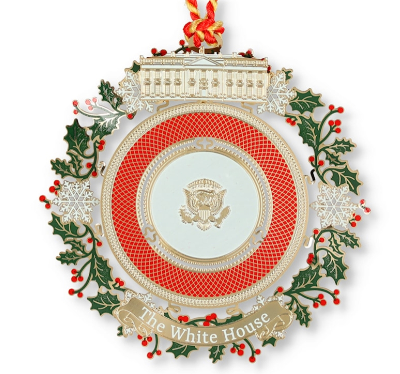 Designed by the White House Historical Association Made of solid brass and finished in 24K gold, the Official 2025 White House Christmas Ornament celebrates the history and traditions of presidential diplomacy by highlighting two iconic State China Services. The two plates on the front and back of the ornament serve as emblems of the legacy of diplomacy and fine dining. Each ornament ships in a keepsake box, with a ribbon for hanging and a booklet describing the history of State Dinners and the china that made the dinners exquisite.