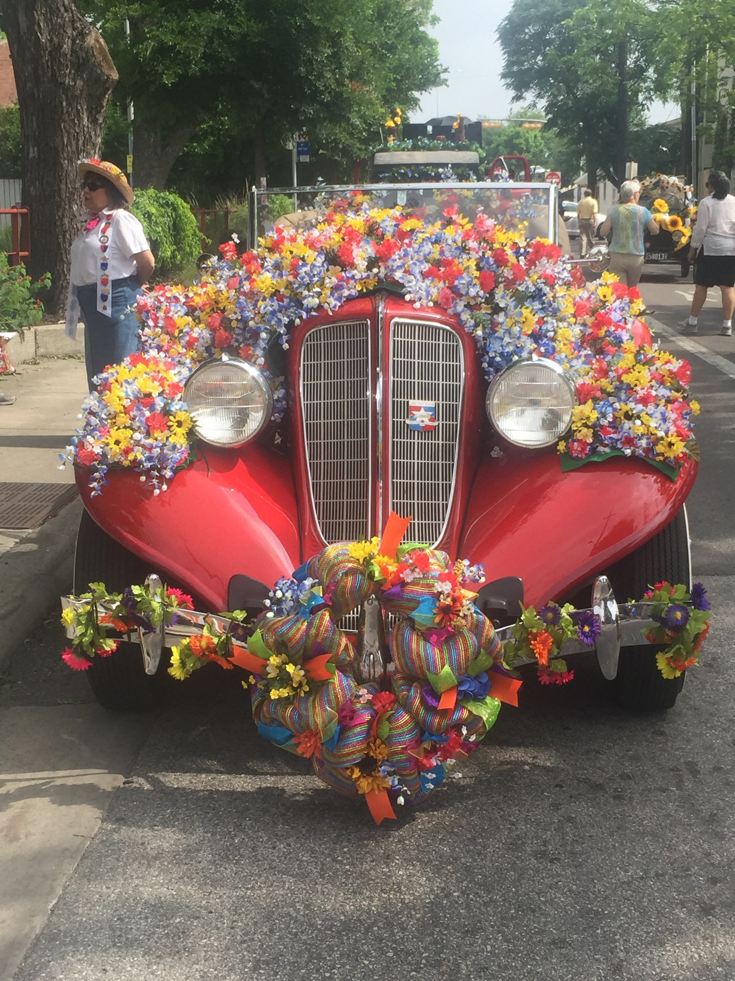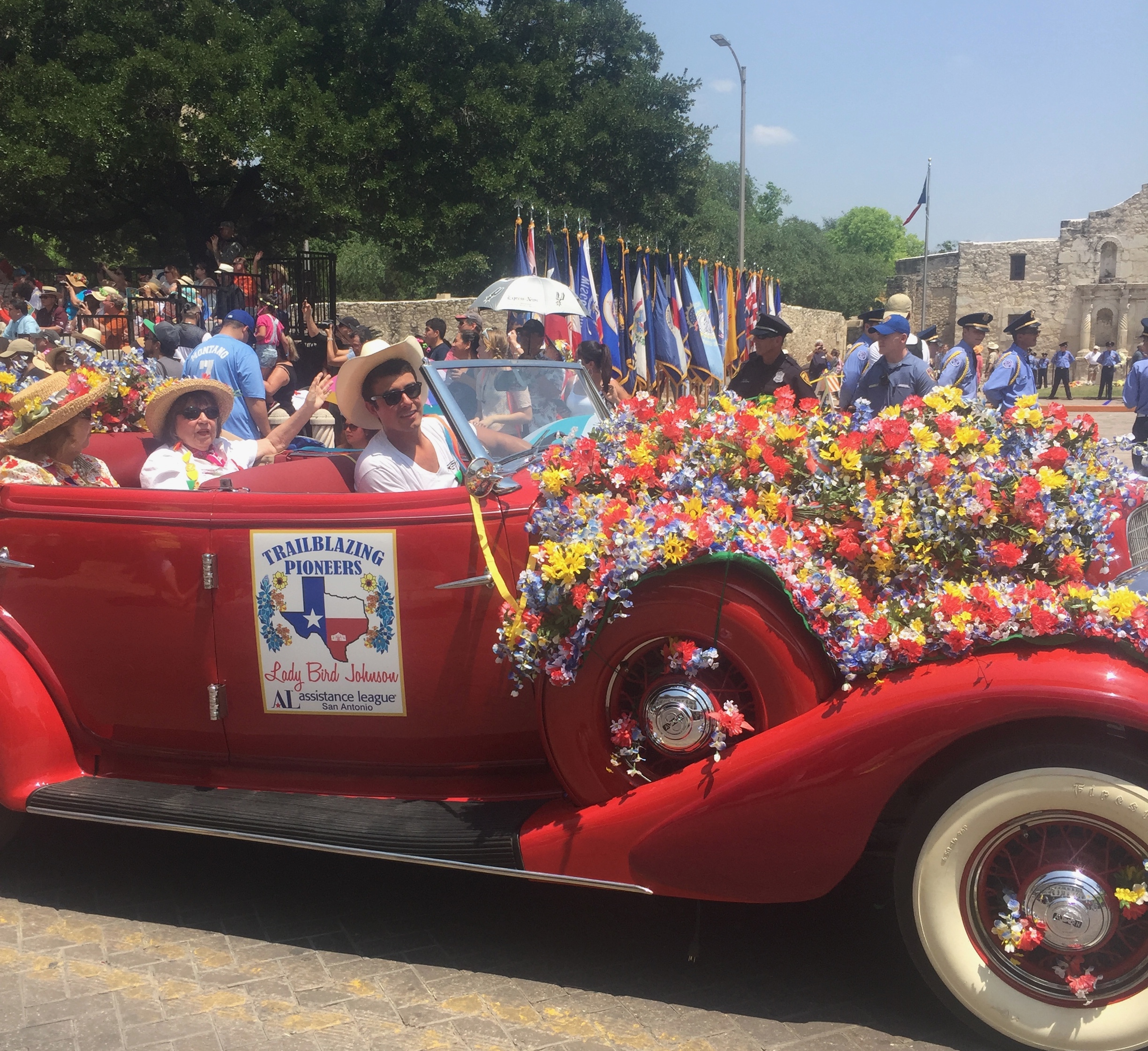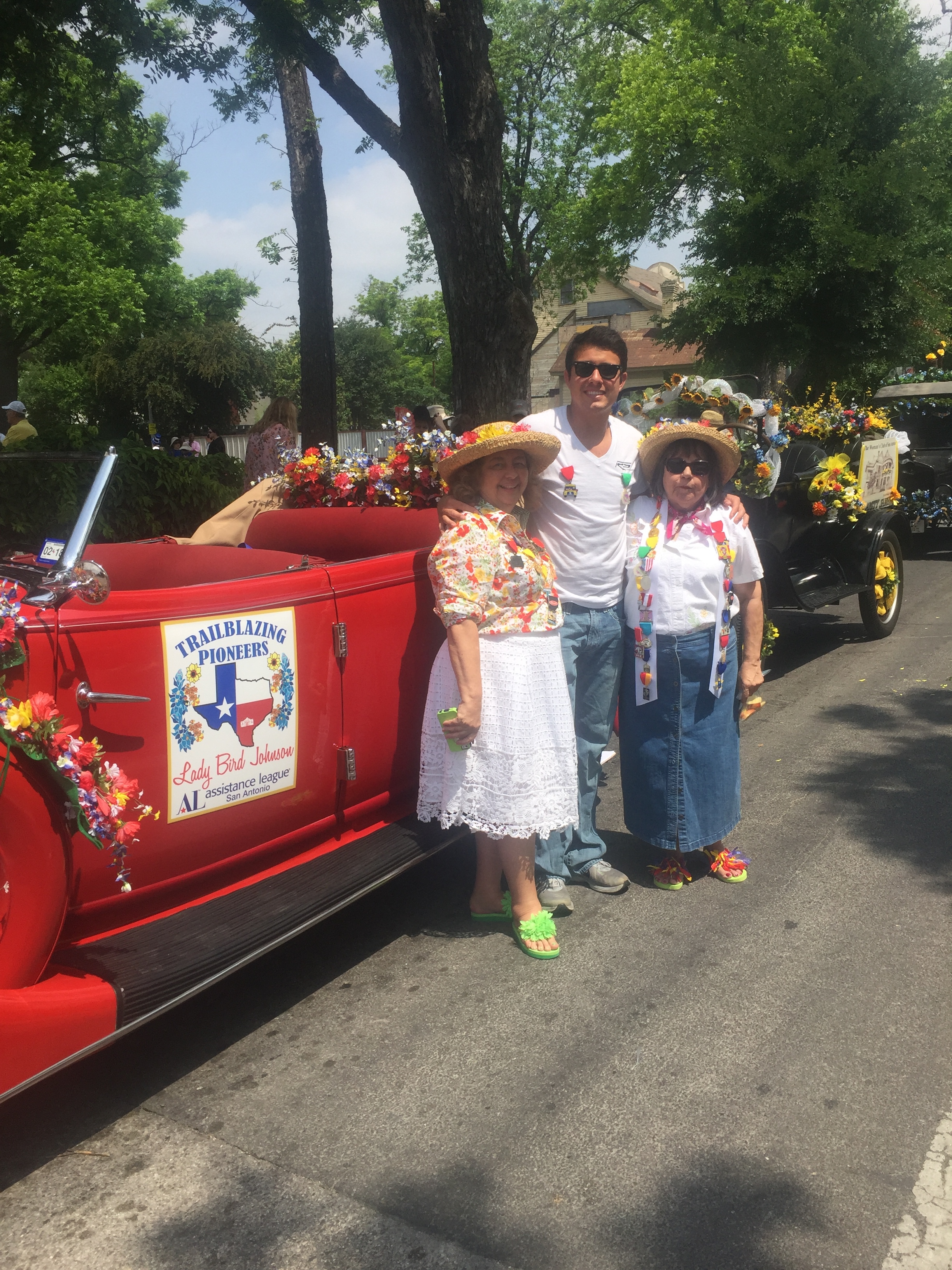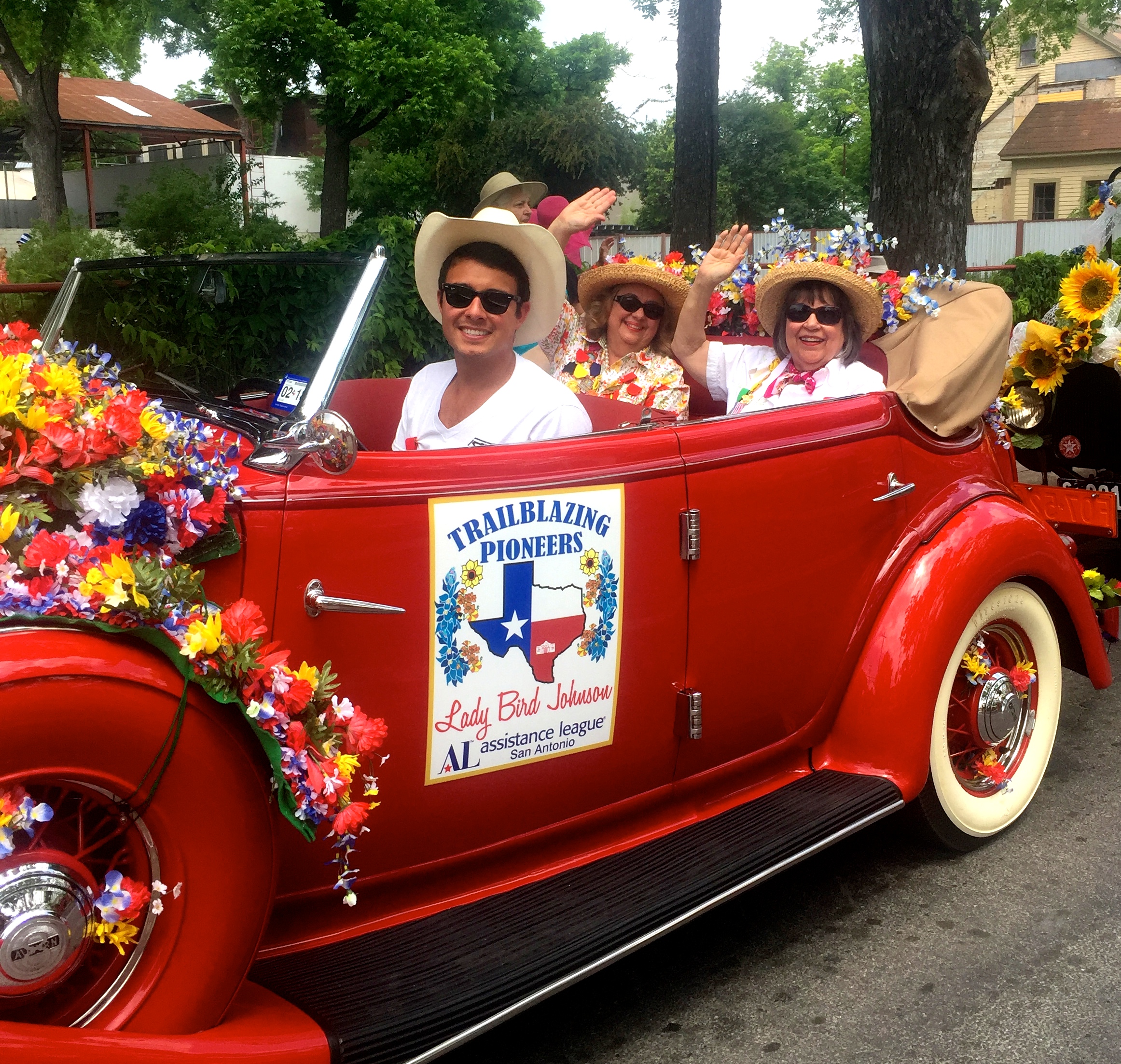 Assistance League of San Antonio’s Battle of Flowers Parade entry was decorated with Texas wildflowers in honor of Trailblazing Pioneer Lady Bird Johnson. Diane Branche, President, and Nancy Camp, Auxiliary Chairman, rode in the antique 1934 Auburn convertible, driven by Justin Willbanks and provided by RS1Motorworks. Kathy Swift of Kathy’s Kreations created and donated the festive Fiesta wreath on the front of the car and Mary and Ken Zuschlag, working with Budget Signs, designed the car’s signage. Thank you to everyone! Viva Fiesta!