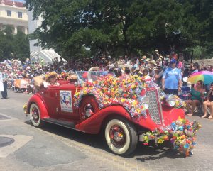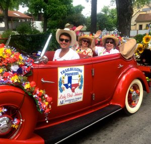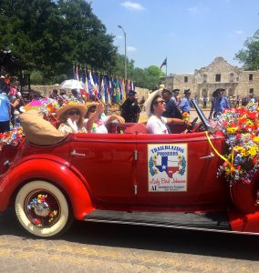 Assistance League of San Antonio’s Battle of Flowers Parade entry was decorated with Texas wildflowers in honor of Trailblazing Pioneer Lady Bird Johnson. Diane Branche, President, and Nancy Camp, Auxiliary Chairman, rode in the antique 1934 Auburn convertible, driven by Justin Willbanks and provided by RS1Motorworks. Kathy Swift of Kathy’s Kreations created and donated the festive Fiesta wreath on the front of the car and Mary and Ken Zuschlag, working with Budget Signs, designed the car’s signage. Thank you to everyone! Viva Fiesta!