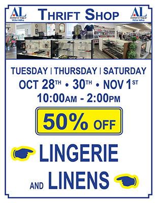Thrift Shop Sale for Oct 28 • 30 • Nov 1Assistance League of Victor Valley’s Thrift Shop is located at 22021 Outer Highway 18 South, Apple Valley, CA 92307. Shop is open on Tuesdays, Thursdays and Saturdays from 10am…